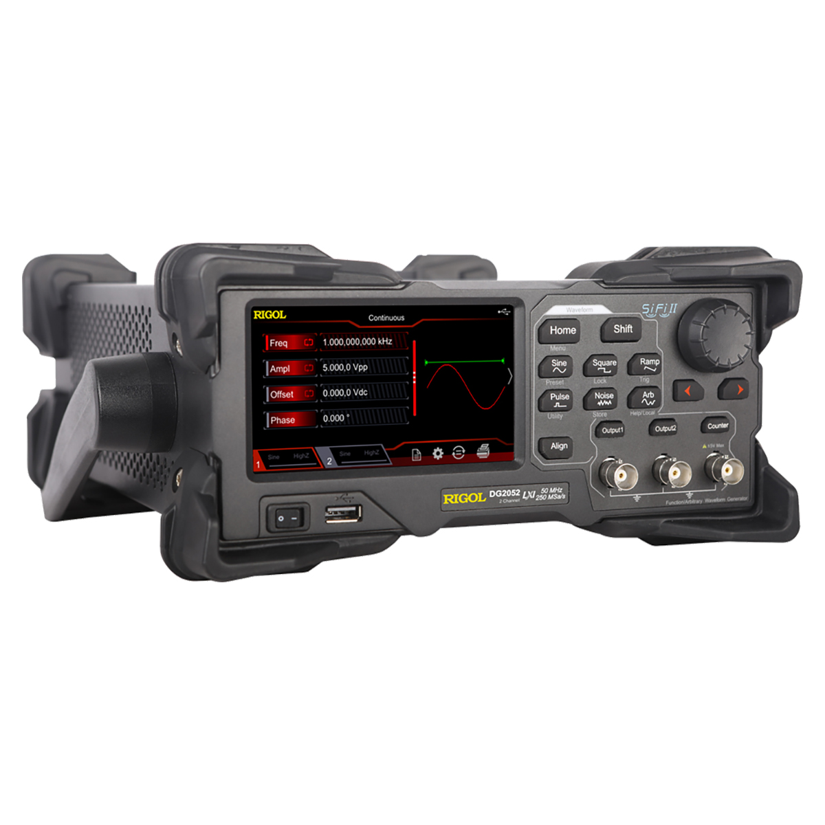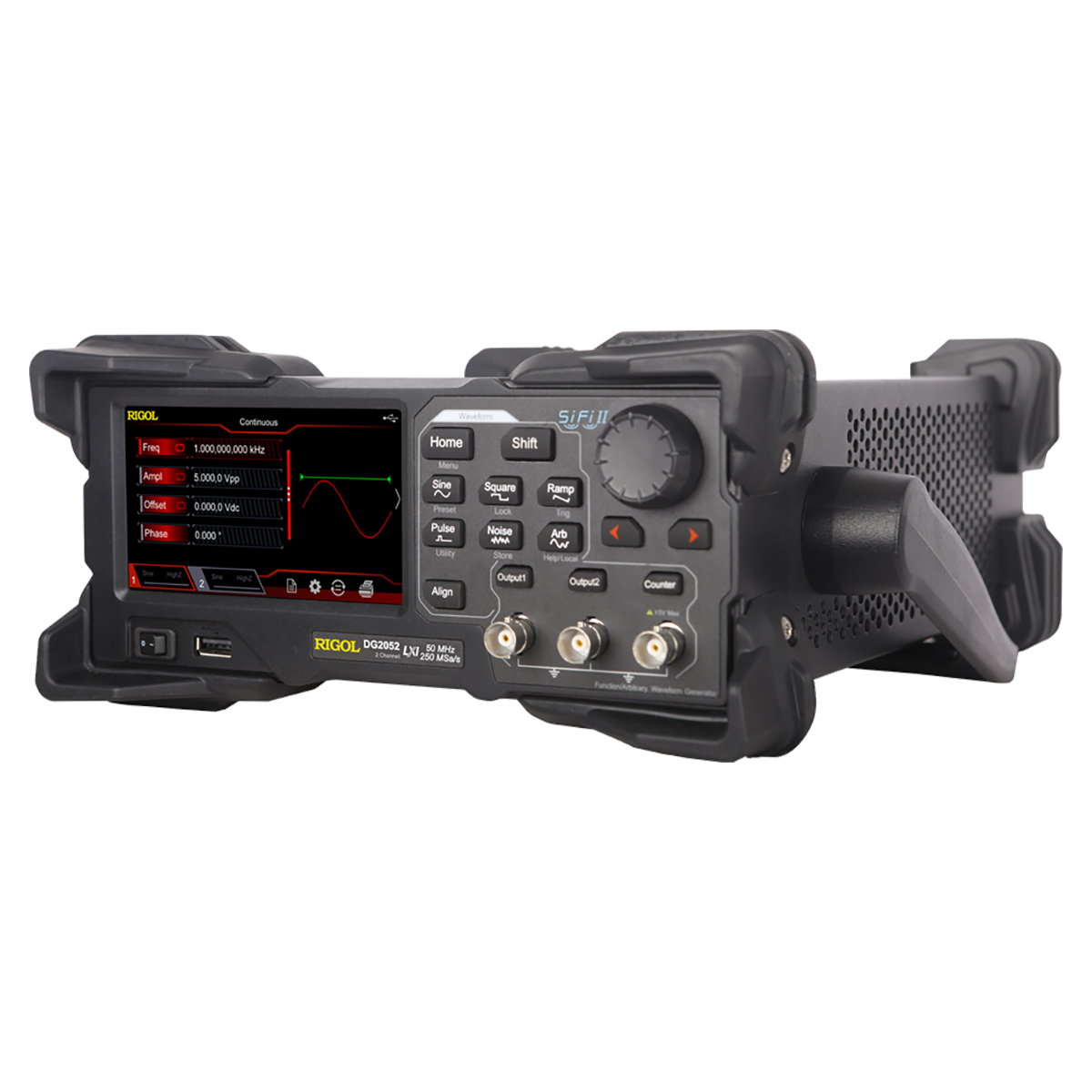 DG2052 — современный, многофункциональный генератор функций / сигналов произвольной формы. Обладает функциями генератора функций, генератора сигналов произвольной формы, генератора шума, генератора импульсов, генератора кода, генератора гармоник, аналогового / цифрового модулятора, частотомера и проч. Эргономичный суперсовременный дизайн и интуитивно понятный интерфейс станут дополнительным удобством для пользователя. Серия DG2000 имеет большой, цветной сенсорный дисплей 4,3″, интерфейс USB, USB-GPIB, компактный размер и вес.Максимальный диапазон выходной частоты данной модели — 50 МГц.