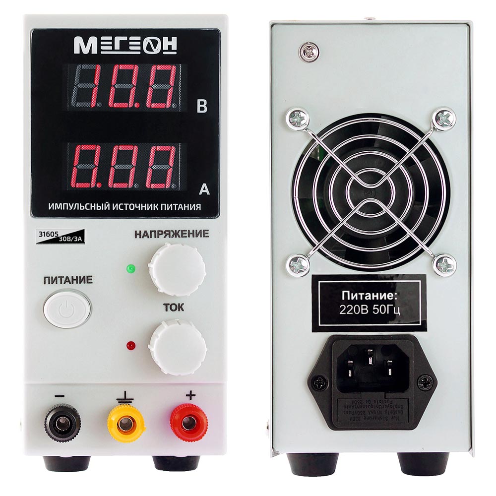 Все необходимые элементы управления расположены на лицевой панели источника питания Мегеон 31605. Установленные параметры напряжения и тока выводятся на дисплей. Данный источник питания обеспечивает высокую стабильность, а также впечатляющие шумовые характеристики, которые соответствуют современным стандартам и позволяют работать с современными электронными устройствами.
