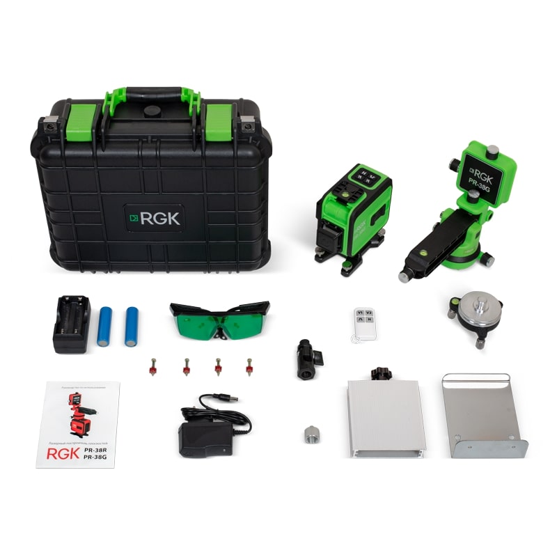 Штанга-упор RGK CG-2, Лазерный уровень RGK PR-38G, Трегер, Магнитный кронштейн, Металлическая пластина для крепления к стене, Подъемная площадка, Переходник, Переходник, Крепеж — 4 шт. (4 шт.), Зарядное устройство, Пульт, Блок под аккумуляторы, Аккумулятор — 2 шт. (2 шт.), Кейс, Инструкция