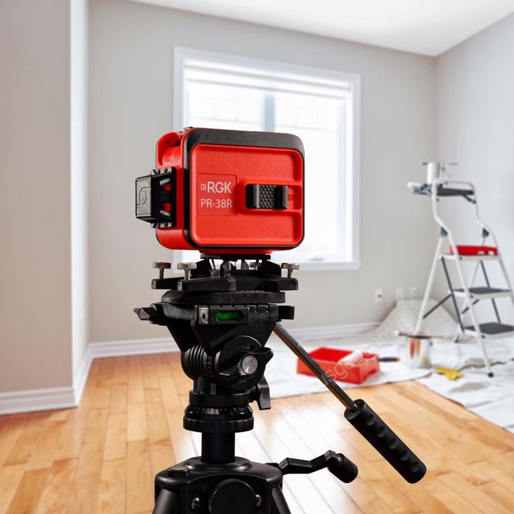 Устройство лазерного уровня RGK PR-38R при необходимости можно расположить почти вплотную к стенам. Это значительно упрощает выравнивание по углам и обеспечивает точность при выравнивании штукатурки и укладке плитки.