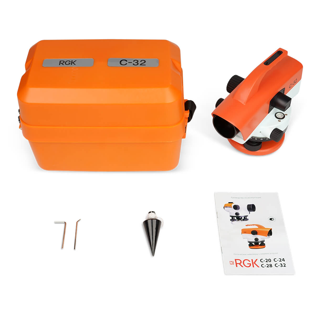 Нитяной отвес, Юстировочный набор, Транспортировочный кейс, Руководство по эксплуатации, Алюминиевый штатив RGK S6-N, Рейка нивелирная AMO S4, Оптический нивелир RGK C-32