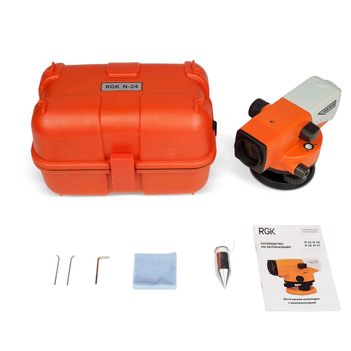 Пластиковый кейс, Крышка объектива, Нитяной отвес, Салфетка, Юстировочные шпильки — 3 шт. (3 шт.), Алюминиевый штатив RGK S6-N, Рейка нивелирная AMO S3, Оптический нивелир RGK N-24, Руководство по эксплуатации