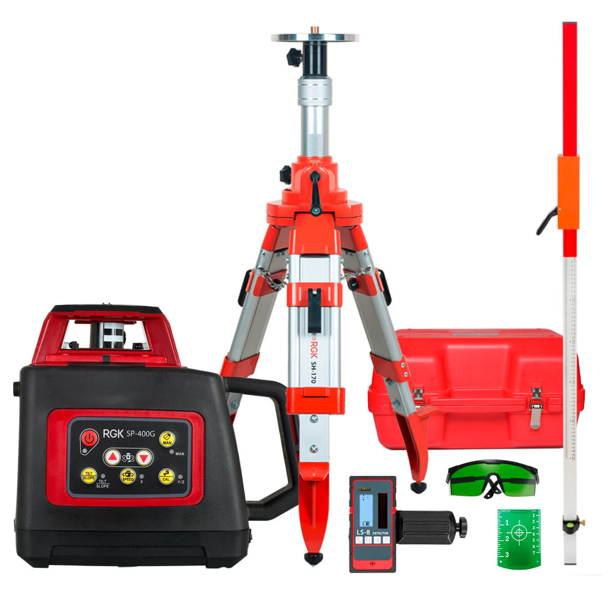 Комплект: ротационный нивелир RGK SP-100 + элевационный штатив RGK SH-170 + рейка RGK LR-2 + дальномер RGK DL100