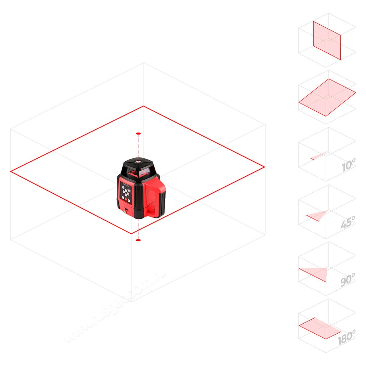 Лазерный уровень RGK SP-800 + штатив RGK SH-170 позволяет отстраивать в пространстве горизонтальную и вертикальную плоскость на 360°, а также проектировать точку зенита, для быстрого переноса точки с пола на потолок. В зависимости о вида работ, пользователь может вручную задавать скорость вращения лазерной головки в четырех режимах – 100, 300, 600 оборотов в секунду, а также полностью отключать вращение для проецирования одного луча.