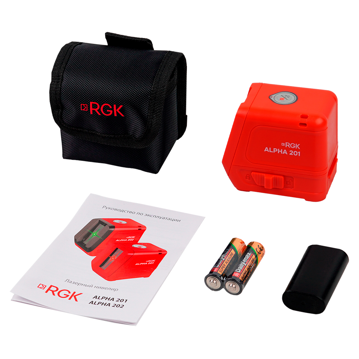 Лазерный уровень RGK ALPHA 201, Слот АА, Батарейки АА — 2 шт., Чехол, Руководство по эксплуатации