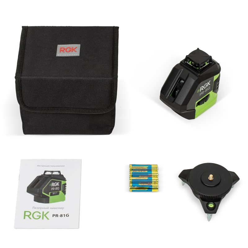 Лазерный уровень RGK PR-81G, Трегер, Батарейки — 4 шт. (4 шт.), Сумка, Инструкция
