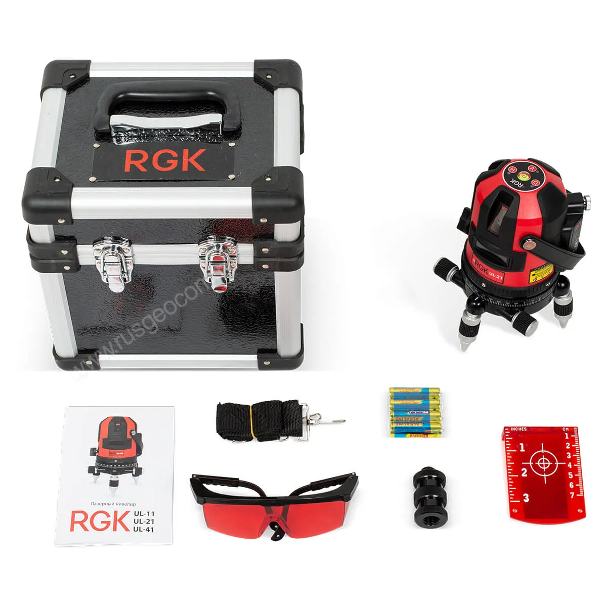 Мишень RGK TP-1 красная, Лазерные очки, Лазерный уровень RGK UL-21, Переходник, Ремень, Батарейки — 4 шт. (4 шт.), Кейс, Инструкция