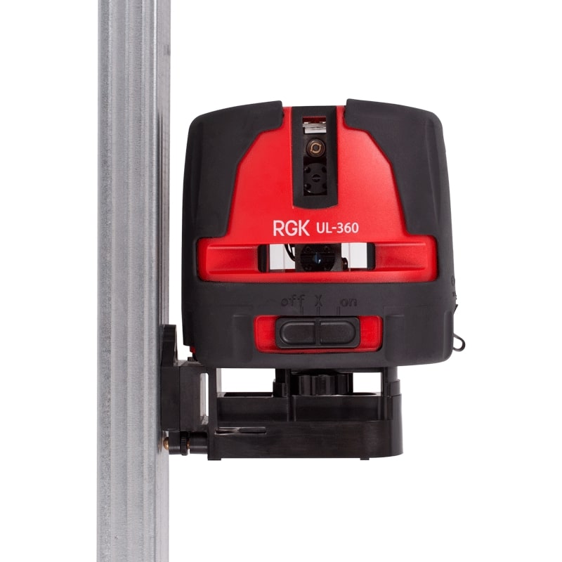 Для удобства нанесения разметки лазерный нивелир RGK UL-360 можно установить на штатив, для чего в нижней части устройства предусмотрена резьба 1/4”. Поставляемое в комплекте магнитное крепление даёт возможность закрепить нивелир на металлической поверхности на любой высоте, в углу комнаты или в другом недоступном месте. Проработанная конструкция корпуса и тщательно подобранные материалы обеспечивают надёжную защиту устройства нивелира от негативных факторов. Бесперебойное функционирование RGK UL-360 гарантировано в диапазоне от -5°C до +45°C, что позволяет работать с ним практически в любых помещениях.