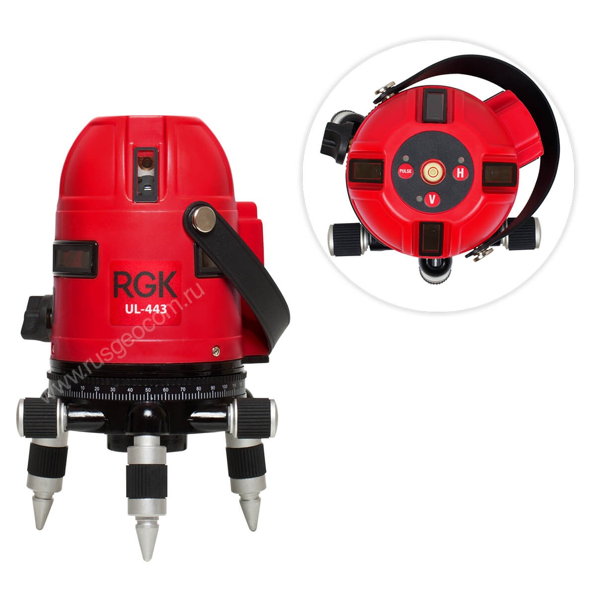 Корпус RGK UL-443  выполнен из качественных материалов и обеспечивает надёжную защиту прибора от строительной пыли и влажности. Питание прибора осуществляется от стандартных батареек типа АА. Прибор поставляется в ударопрочном кейсе.