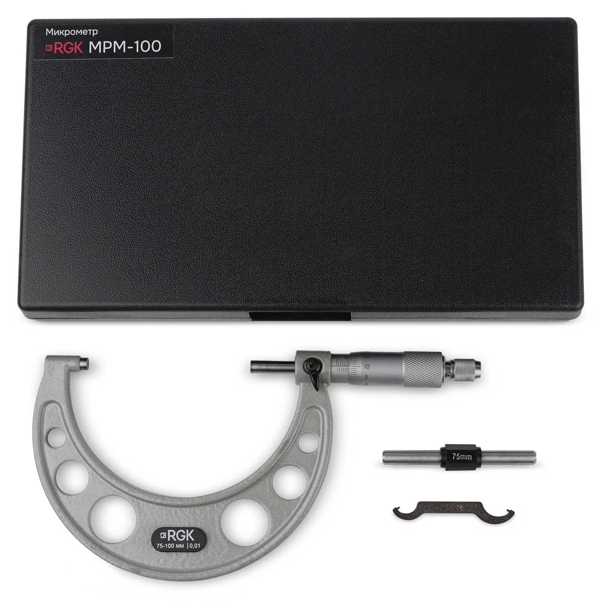 Микрометр RGK MPM-100 представляет собой ручной измерительный инструмент точного класса с рабочим диапазоном от 75 до 100 мм, который соответствует типу МК по ГОСТ 6507. Основным его отличием от модели MCM-100, обладающей таким же разрешением и пределами измерений, является конструкция скобы. Ее дугообразная форма оптимизирована для контроля размеров изделий круглого сечения, а за счет сквозных отверстий снижен общий вес инструмента и минимизировано влияние теплового расширения материала на точность получаемых результатов.