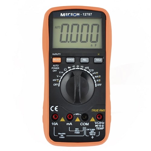 МЕГЕОН 12787 (True RMS) – надежный и высокоэффективный цифровой мультиметр, который позволяет измерять переменное (True RMS) или постоянное напряжение, переменный (True RMS) или постоянный ток, частоту, емкость, сопротивление, температуру, а также может использоваться для выполнения проверки диодов, транзисторов и «прозвонки» цепи. Результаты измерений выводятся на ЖК-дисплей с легко читаемым цифровым индикатором 42 мм. Наличие подсветки ЖК-дисплея с функцией выключения через 10 с, режима энергосбережения и защита от перегрузки повышает удобство его эксплуатации. БИС АЦП с двойным интегрированием в основе прибора МЕГЕОН 12787 (True RMS) делает его надежным и востребованным измерительным прибором в лабораториях, на производстве и в домашнем хозяйстве.