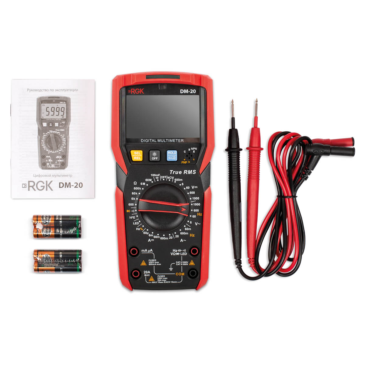 Мультиметр цифровой RGK DM-20, Кабель измерительный с пробниками — 2 шт., Батарея питания ААА — 4 шт., Руководство по эксплуатации