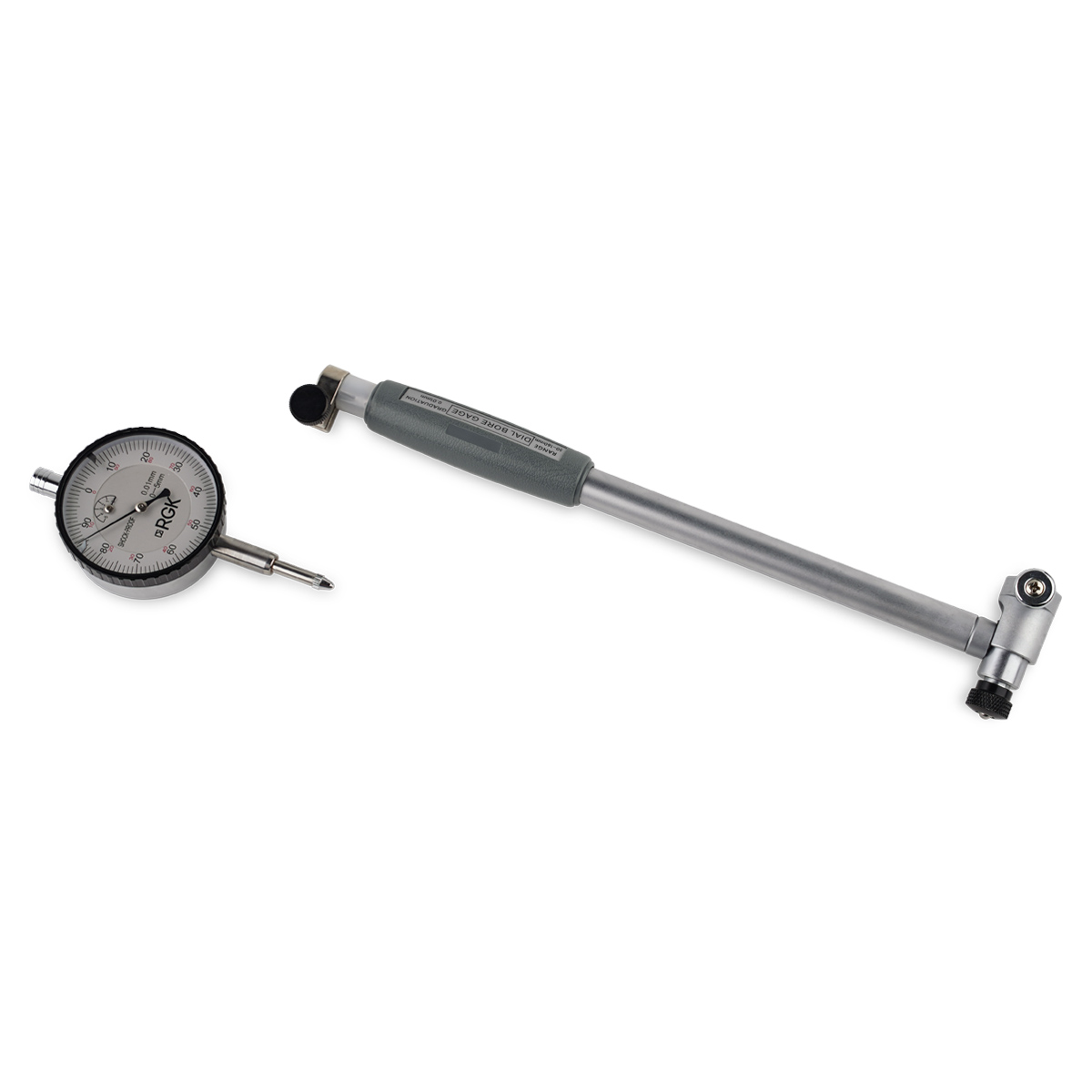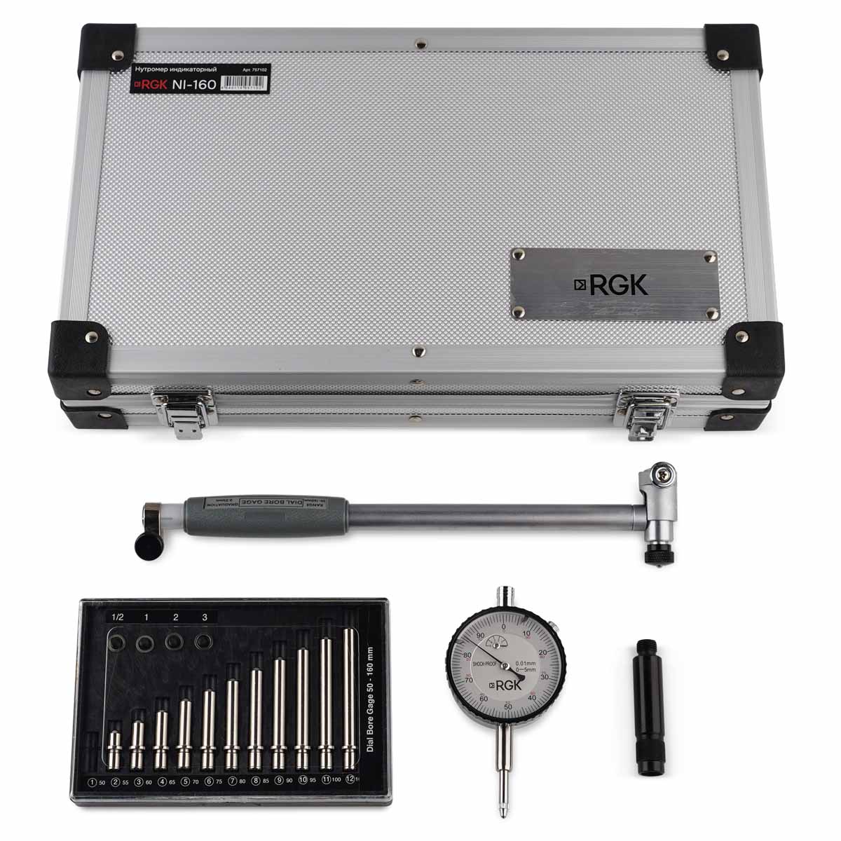 Для настройки индикаторного нутромера RGK NI-160 на номинальный диаметр отверстия в комплект поставки включен набор стержней с шагом увеличения размера в 5 мм и шайбы-проставки толщиной 0.5, 1, 2 и 3 мм. Измерительная головка инструмента снабжена дополнительными подпружиненными роликами, которые обеспечивают автоматическое центрирование линии измерений в цилиндрическом канале. Считывание величины отклонения фактических геометрических параметров объекта контроля от установленного номинала производится по показаниям многооборотного индикатора часового типа с пределом измерений до 5 мм и ценой деления шкалы в 0,01 мм. Для выставки нулевого положения относительно стрелки предусмотрена возможность поворота циферблата за наружное кольцо.