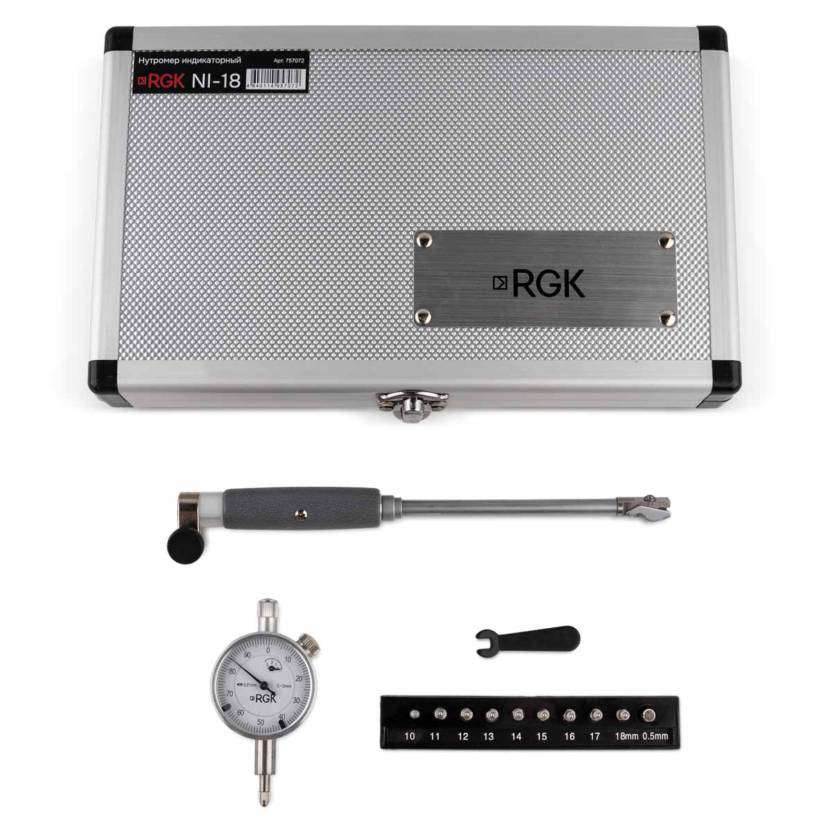 Нутромер RGK NI-18 позволяет определять диаметр круглых отверстий и ширину канавок и пазов с параллельными стенками в диапазоне от 10 до 18 мм на глубине до 100 мм, представляя собой измеритель двухточечного типа, с подвижным измерительным элементом и неподвижным сменным стержнем калиброванной длины. Отклонения от образцового размера, относительно которого производится замер, определяется по показаниям стрелки часового индикатора. В комплект поставки входит набор измерительных стержней с шагом 1 мм от 10 до 18 мм и дополнительная проставка 0,5 мм, а также монтажный ключ и жесткий футляр.