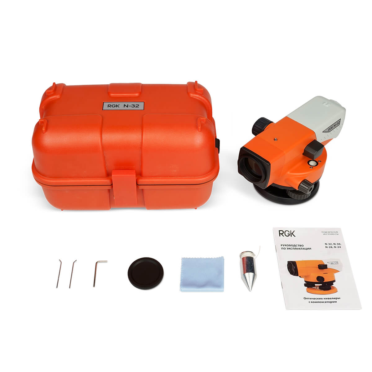 Пластиковый кейс, Крышка объектива, Нитяной отвес, Салфетка, Юстировочные шпильки — 3 шт. (3 шт.), Руководство по эксплуатации, Оптический нивелир RGK N-32