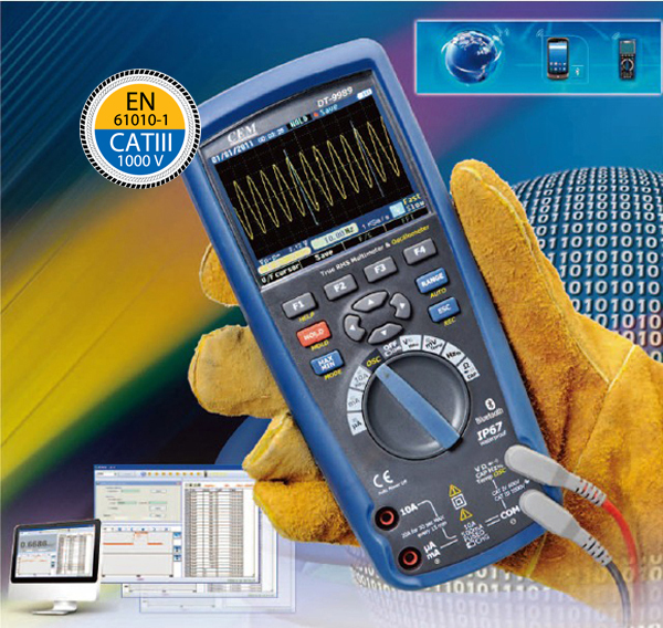 Профессиональный, промышленный цифровой мультиметр TRMS DT-9989 с функциями осциллографа и цветным ЖК-экраном TFT обладает высоким быстродействием, точностью, встроенными функциями регистратора данных и вывода графиков. Прибор оснащен Bluetooth (беспроводной системой передачи данных) с возможностью передавать данные на ПК и смартфон (Android) с помощью ПО Meterbox iMM Classic, а также памятью для записи информации. Благодаря двойному пластиковому водонепроницаемому корпусу (класс защиты IP67) мультиметр обеспечивает высокую безопасность работы.