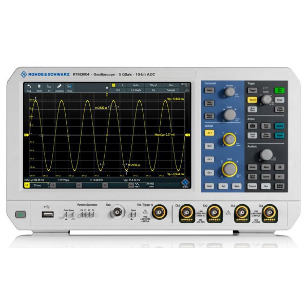 Осциллограф RTM3004, сконструированный компанией Rohde & Schwarz, является представителем новой линейки RTM3000. Данная серия оборудования была представлена в начале 2018 года и за небольшой промежуток времени получила массу положительных откликов от специалистов многих промышленных направлений. Из основных технических характеристик стоит отметить наличие четырех изолированных разъемов и полосу пропускания 100 МГц. Главной отличительной особенностью этой модели можно назвать 10 битный аналого-цифровой преобразователь собственной разработки. По сравнению с классическим 8-битным АЦП, он обеспечивает четырехкратное улучшение вертикального разрешения. Это гарантирует обнаружение малейших единичных аномалий и отклонений.