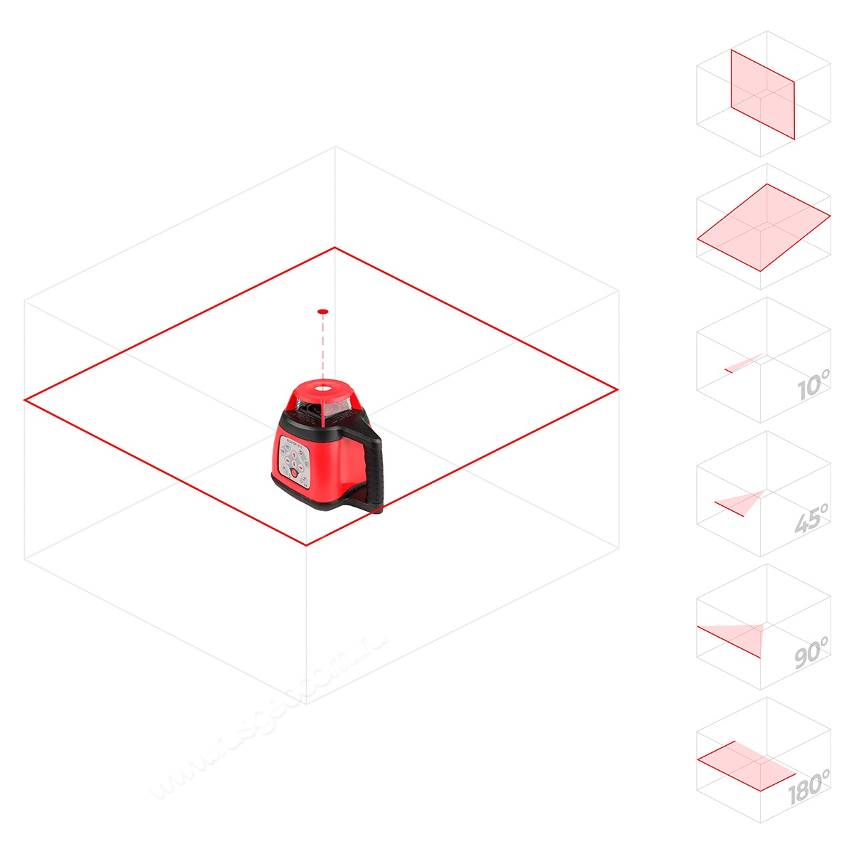 Режим сканирования. Для работы на ограниченном участке лазерный уровень SP-100 позволяет проецировать отрезки разной длины. Функция сканирования доступна в режиме 10°, 45°, 90° и 180°.