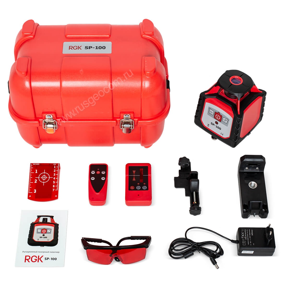 Ротационный нивелир RGK SP-100, Крепление, Трегер, Приемник излучения, Пульт ДУ, Лазерные очки, Мишень, Зарядное устройство, Кейс, Инструкция