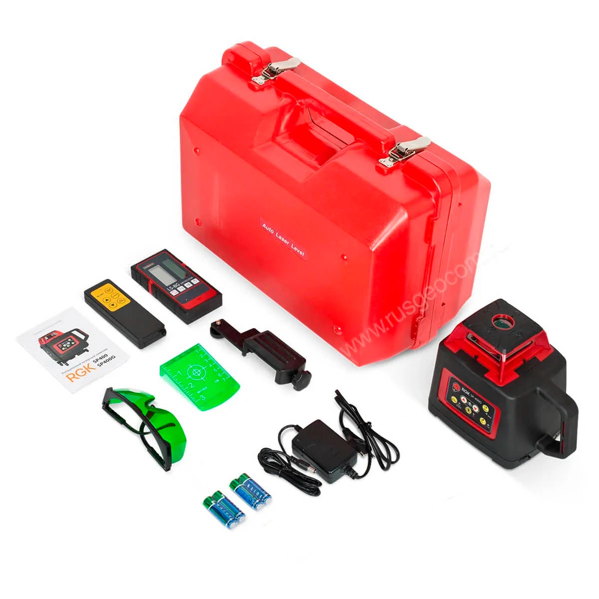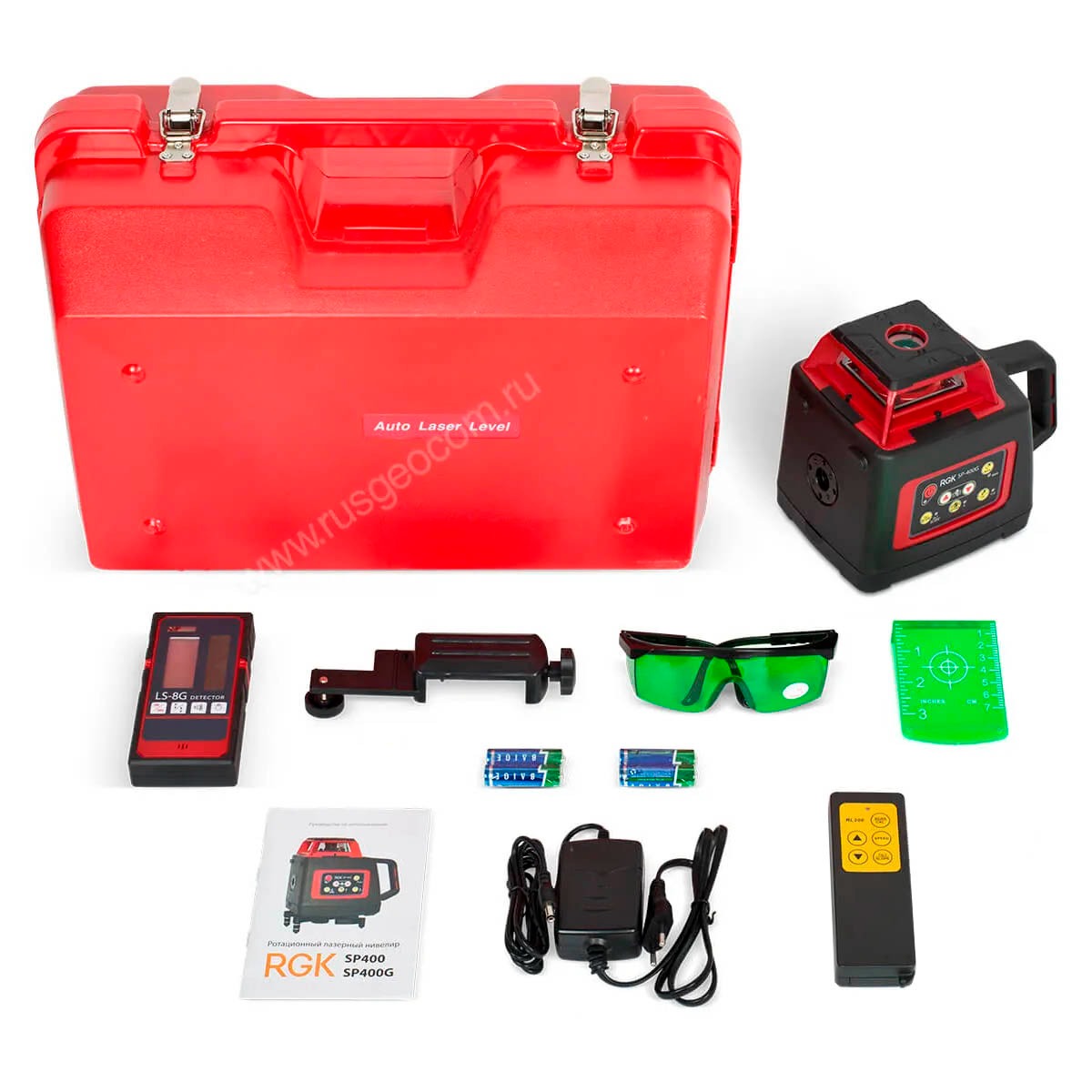 Приемник излучения, Пульт, Крепление, Зарядное устройство, Батарейки — 4 шт. (4 шт.), Кейс, Инструкция, Ротационный нивелир RGK SP-400G, Мишень, Лазерные очки