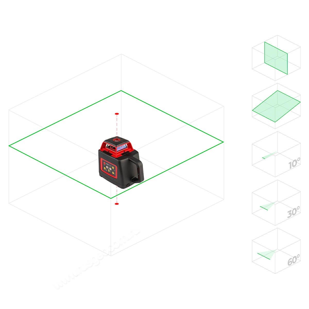 Изменение скорости вращения лазера обеспечивает стабильную видимость линии на всём диапазоне работы и экономию заряда батареи. Ротационный уровень RGK SP-400G поддерживает скорости в 300 и 600 оборотов в минуту. Остановив вращение, можно проецировать статичную точку. Режим сканирования позволяет проецировать сектор с углом 10°, 30° или 60° с одной из двух скоростей, а при остановке фиксирует точку в центре сектора.
