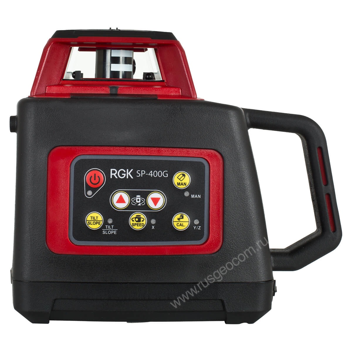 Источник питания — перезаряжаемый аккумулятор, обеспечивающий до 24 часов непрерывной работы. Для зарядки батареи ротационный нивелир RGK SP-400G разъём в основании прибора, закрытый резиновой заглушкой.