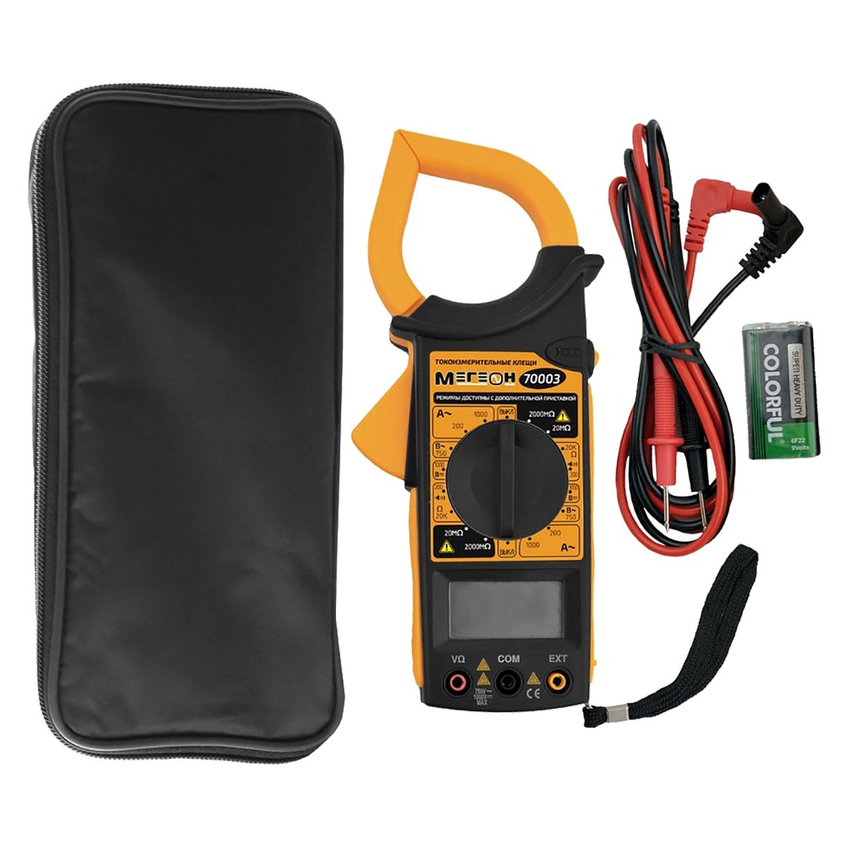 Цифровые токоизмерительные клещи Мегеон 70003 предназначены для измерения постоянного напряжения, переменного или постоянного тока, сопротивления и «прозвонки» цепи. Прибор оснащен ЖК-дисплеем на 3½ разряда и питанием от стандартной батареи 9 B. Все диапазоны измерения имеют защиту от перегрузки. Все функции управления осуществляются одним поворотным переключателем: включение/выключение прибора, выбор функций и диапазон измерения. Данный прибор позволяет совместное использование приставки МЕГЕОН 13820 для реализации функции измерения сопротивления изоляции с испытательным напряжением 500 B. Благодаря удобному чехлу хранить и носить с собой инструмент очень удобно.