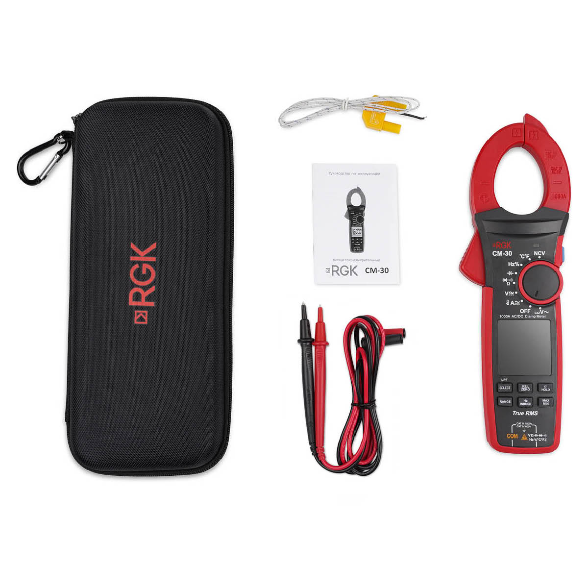 Клещи токоизмерительные RGK CM-30, Комплект тестовых проводов, Термопара типа K, Мягкий чехол, Батареи питания, 1,5 В (ААА) — 3шт, Руководство по эксплуатации