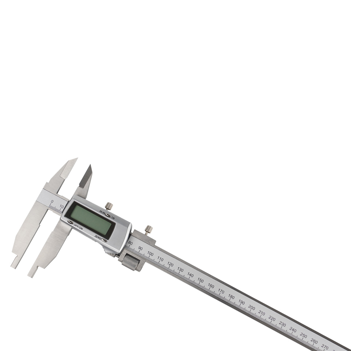 Электронный штангенциркуль RGK SC-II-300, идентичный по конструкции и функциональным возможностям изделию ШЦЦ-II-300-0,01 по ГОСТ 166, обеспечивает измерение размеров изделий и деталей в диапазоне до 300 мм с разрешением 0,01 мм. Модель оснащена механизмом для точной установки положения рамки с микрометрической подачей и двухсторонними губками различной формы: верхняя часть снабжена кромочными, а нижняя – плоскими внутренними и цилиндрическими внешними измерительными поверхностями. Поддерживается возможность установки разметочного приспособления, доступного опционально.