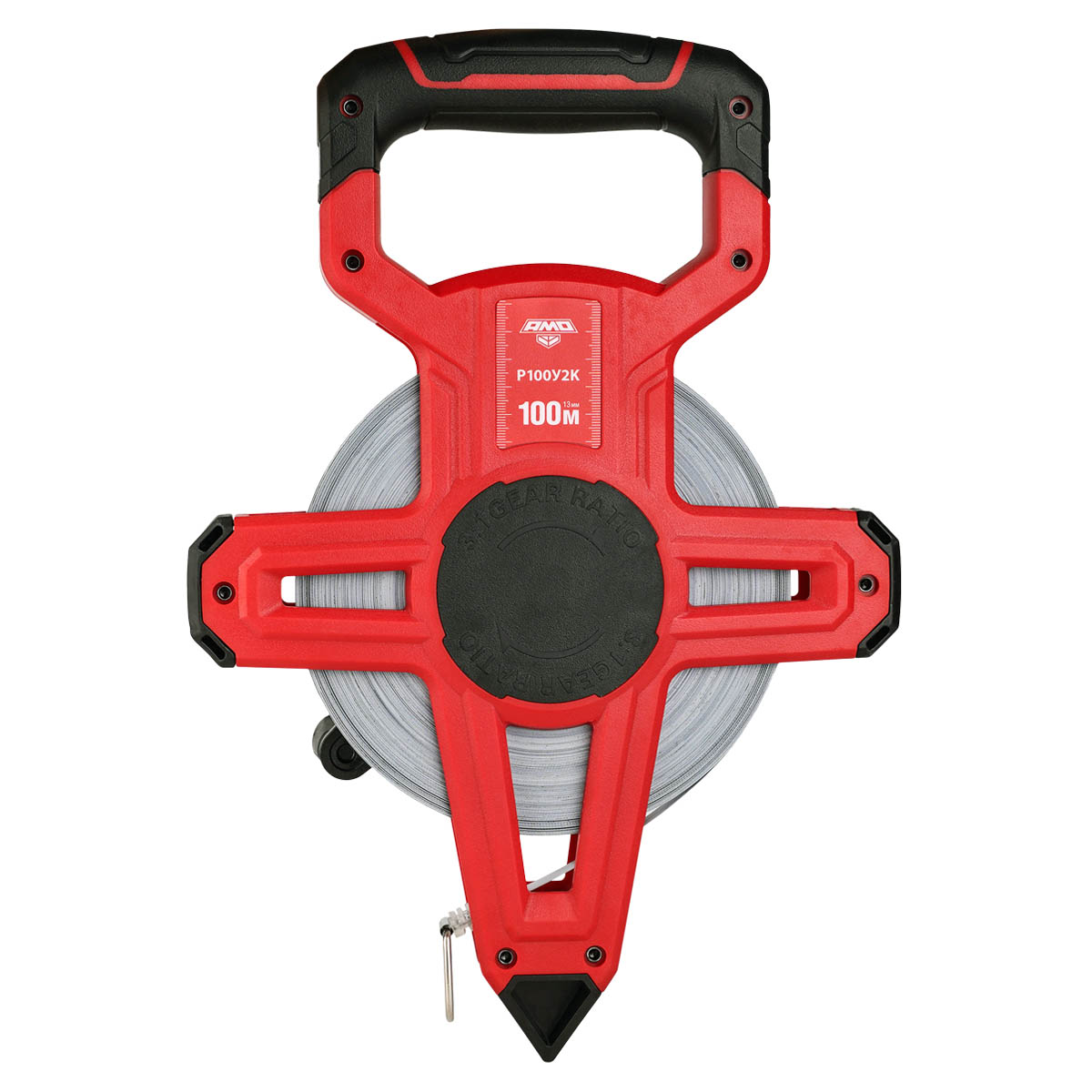 Для быстрого сматывания стальной ленты рулетка AMO Р100У2К оборудована редукторным механизмом с ручным приводом. Это позволяет сэкономить время и силы при работе, что особенно важно на больших строительных объектах.