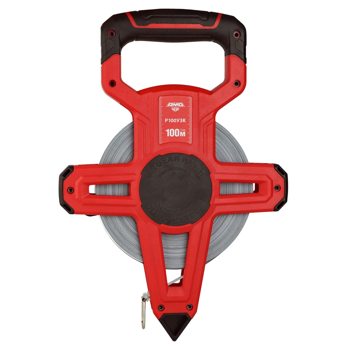 Открытый пластиковый корпус снабжен верхней ручкой, что обеспечивает комфортное удержание инструмента во время работы. Заостренный конец в нижней части позволяет легко установить прибор в выбранной точке, что упрощает процесс измерений. Механизм сматывания ленты редукционного типа позволяет быстро приводить рулетку AMO Р100У3К в исходное состояние после замера, что экономит время и усилия пользователя.